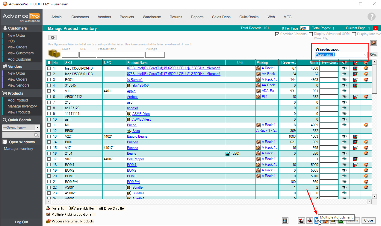 2. Select the warehouse where your product is located and click the MULTIPLE ADJUSTMENT button at the lower right corner