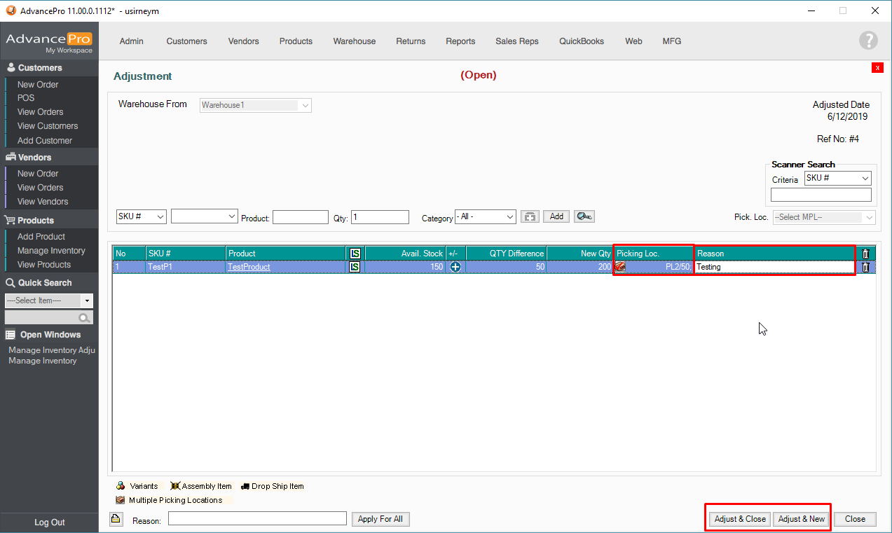 5. Make sure to have a PICKING LOCATION and REASON for adjustment.
