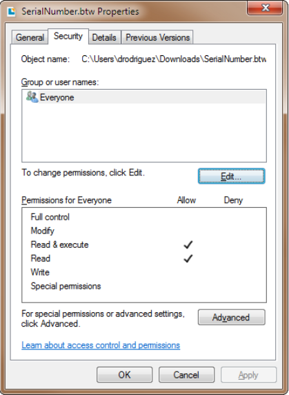 - You now need to make sure that you set the minimum permissions to this file. This will need to be done via the "Advanced" button on this same tab. This is because permissions are being inherited from the object's parent.