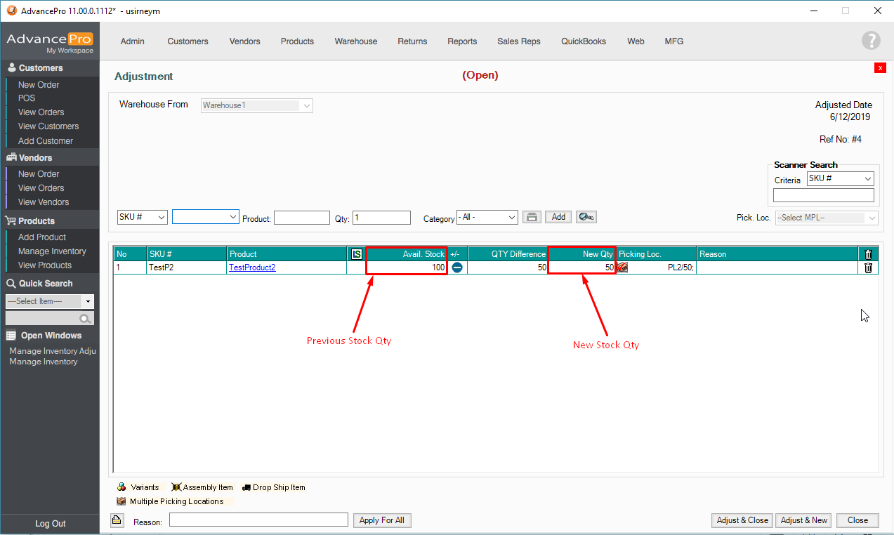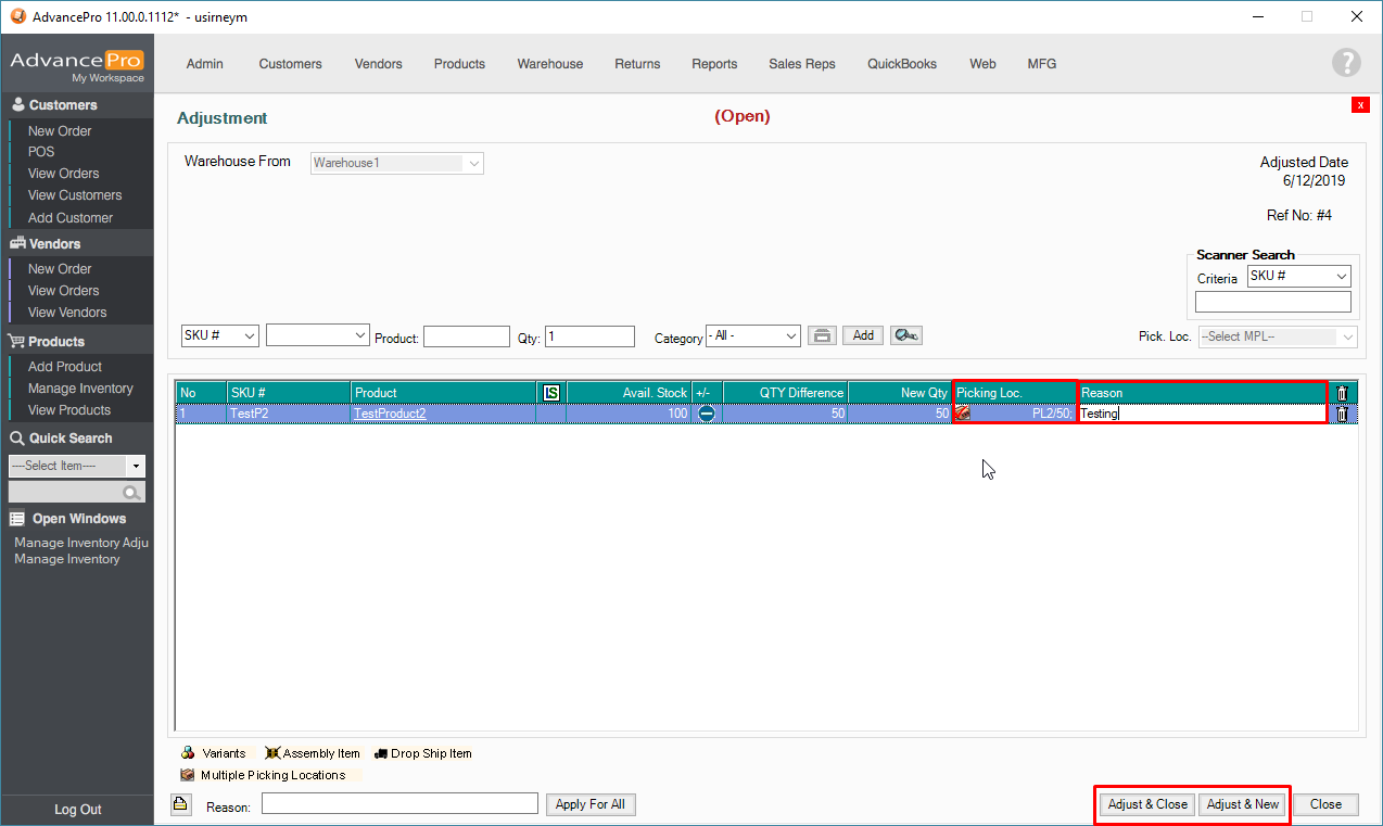 5. Make sure to have a PICKING LOCATION and REASON for adjustment.