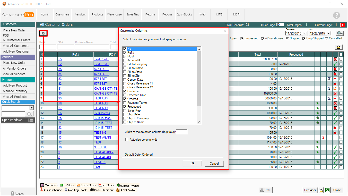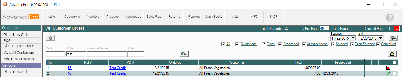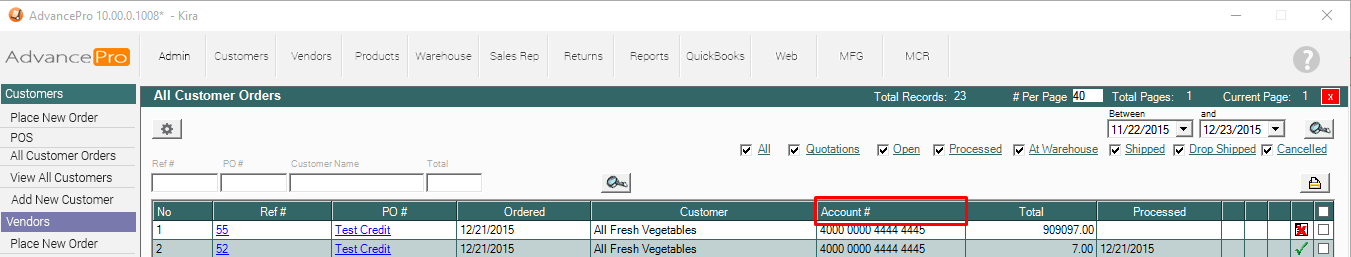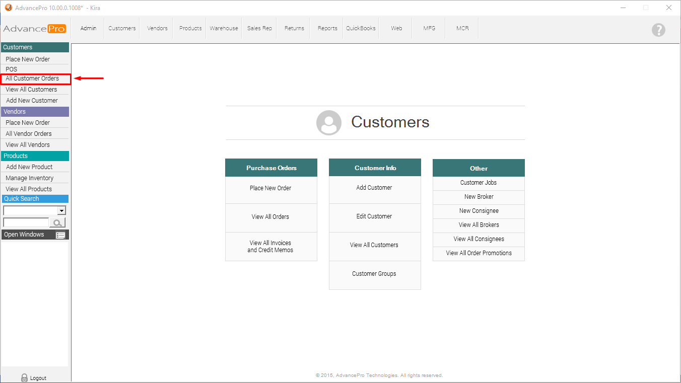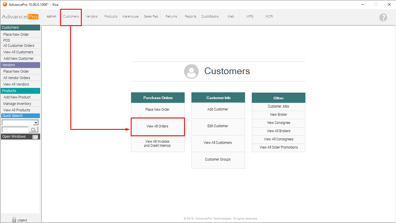 a. Click on Customers > View All Orders to bring up the All Customer Orders Screen