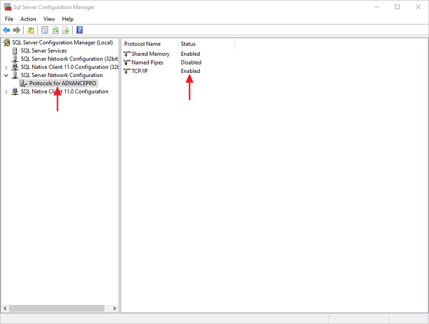 2. Expand the SQL Server Network Configuration section > Select Protocols for ADVANCEPRO > Right-click on TCP/IP and select Enable