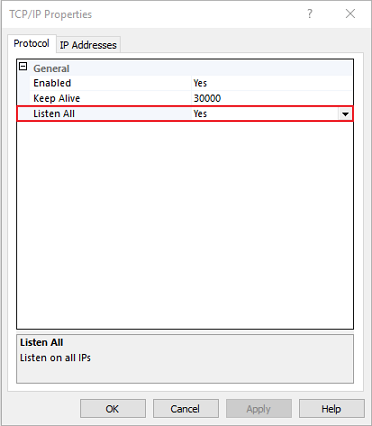 3. Right-click TCP/IP again and select Properties. In the Protocols tab > Set Listen All to Yes