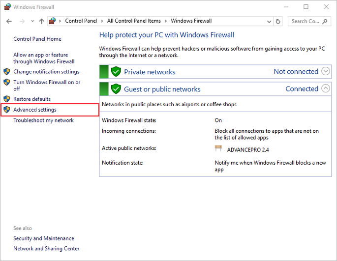8. Select Windows Firewall > On the left pane click Advanced settings