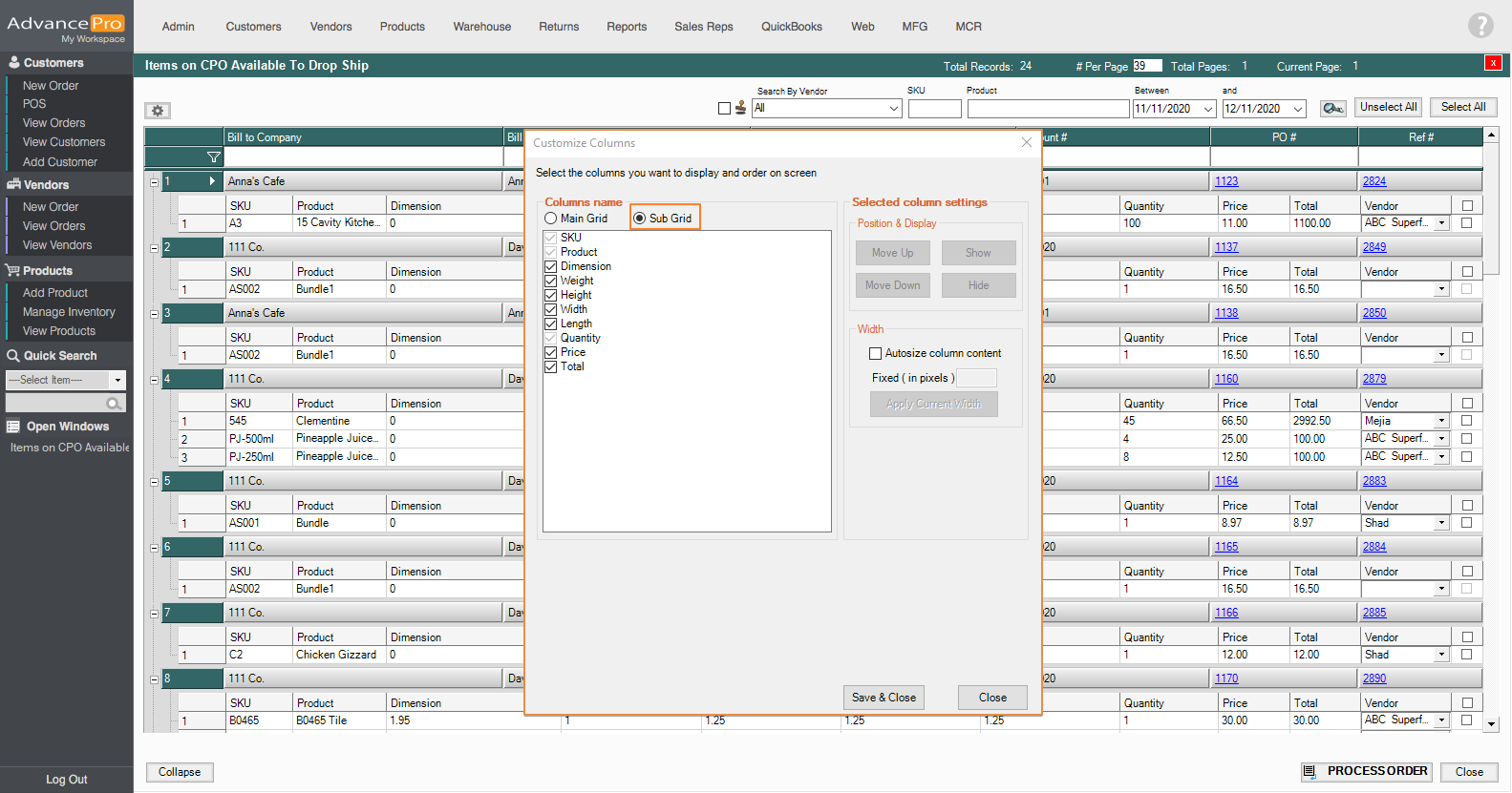 - By clicking on the sub-grid radio button you'll see these columns that are related to the product and the order.