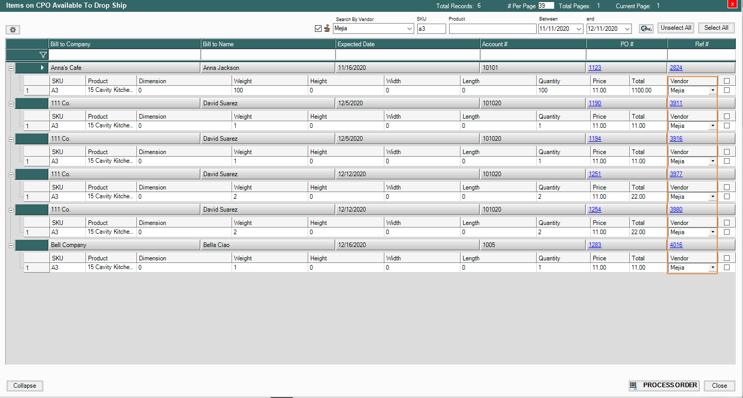- To process the orders, just tick the box on the far right side of the grid and then click on Process Order. You can also use the Select All button beside the magnifying glass.