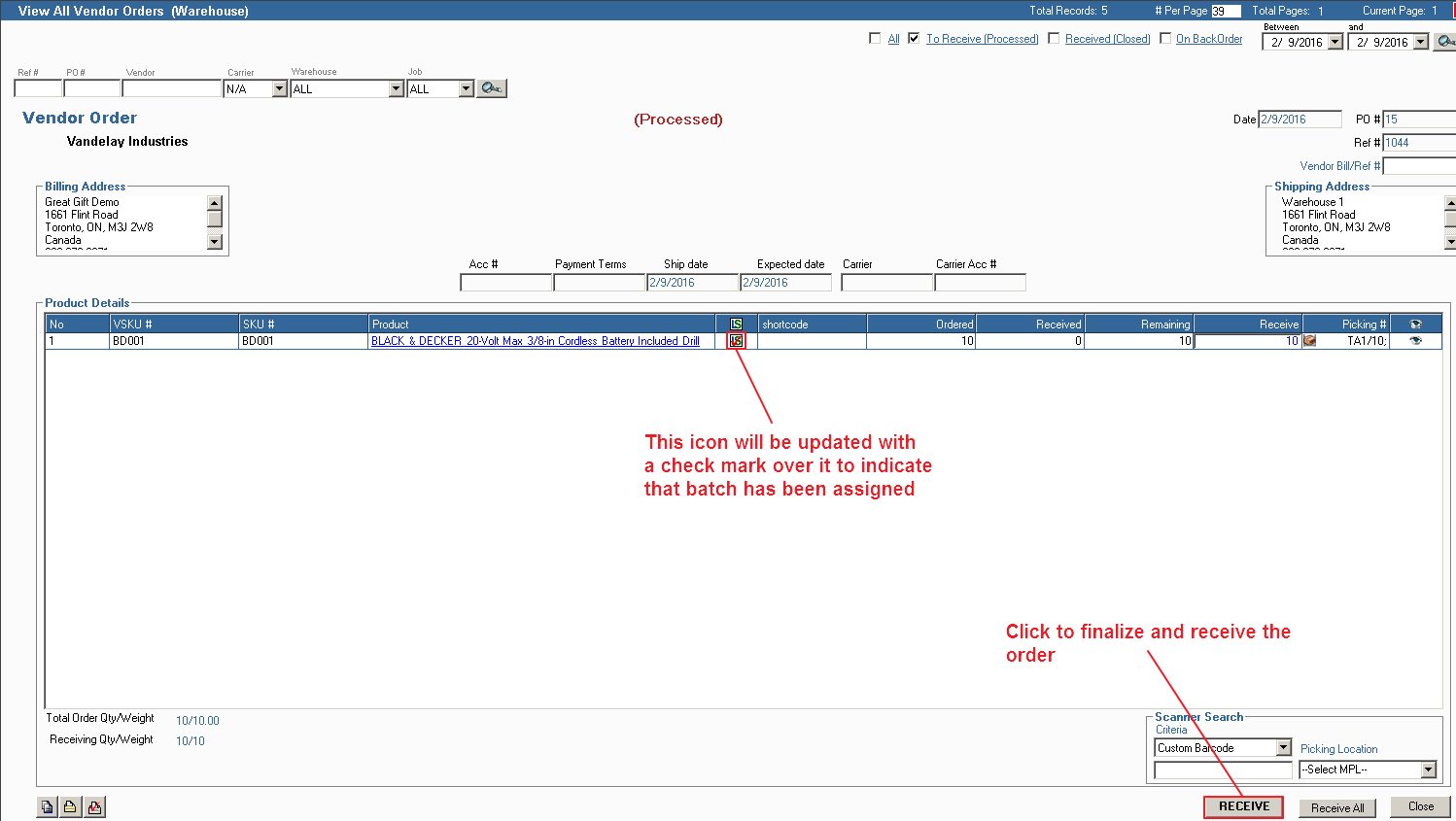 Batch Module - Applying Batch to Receiving Vendor Order