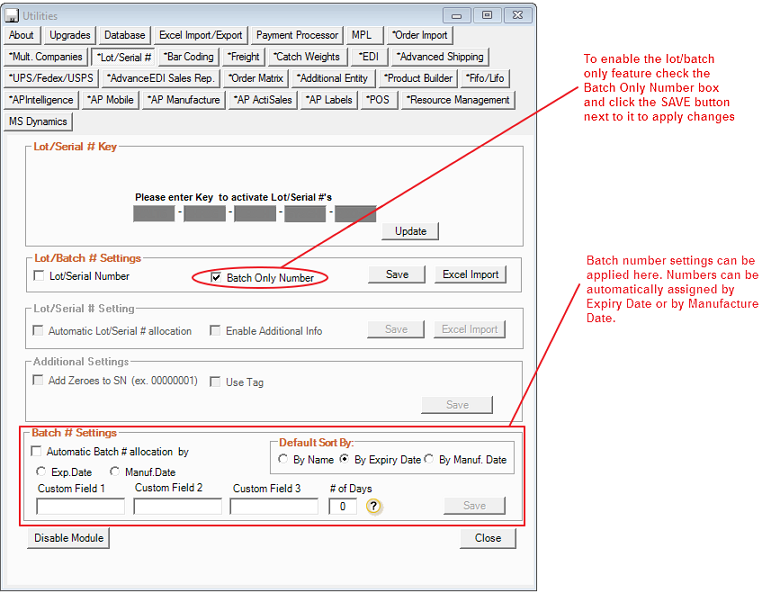 After logging into AdvancePro look under the Admin panel, click Utilities > Click the Lot/Serial # tab to view the module. It should look like the example below (Zoom in as necessary to read text)
