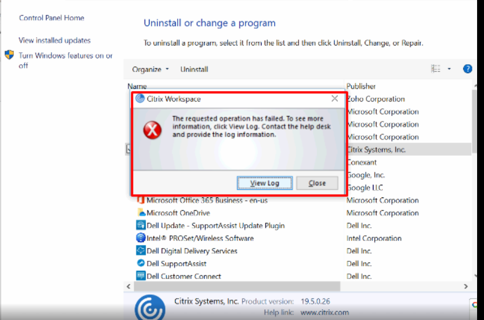 When attempting to install Citrix Receiver for Windows, Citrix Workspace cannot be uninstalled, and shows the error message below