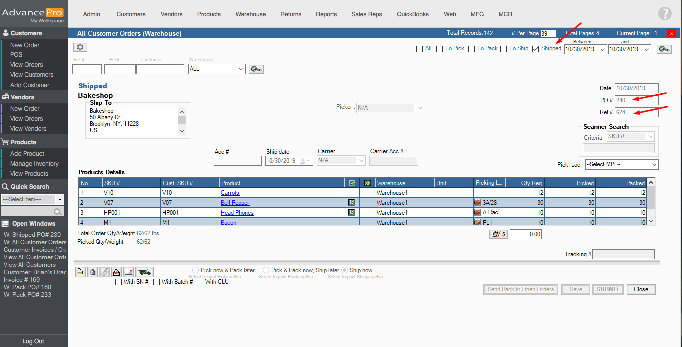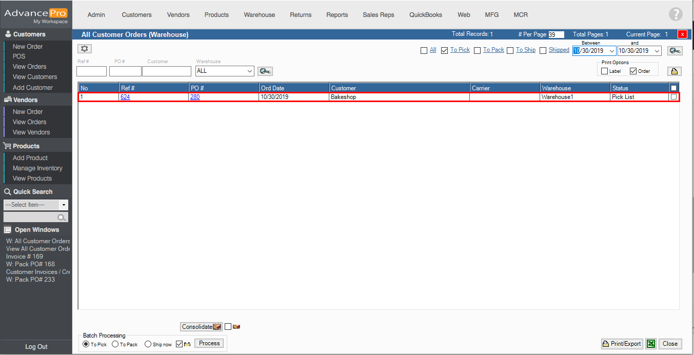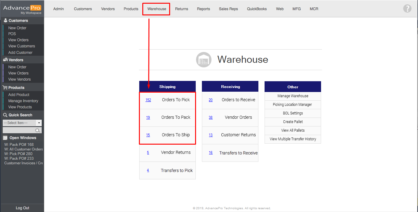 1. Go to Warehouse on the Switchboard > Orders to Pick/Pack/Ship.