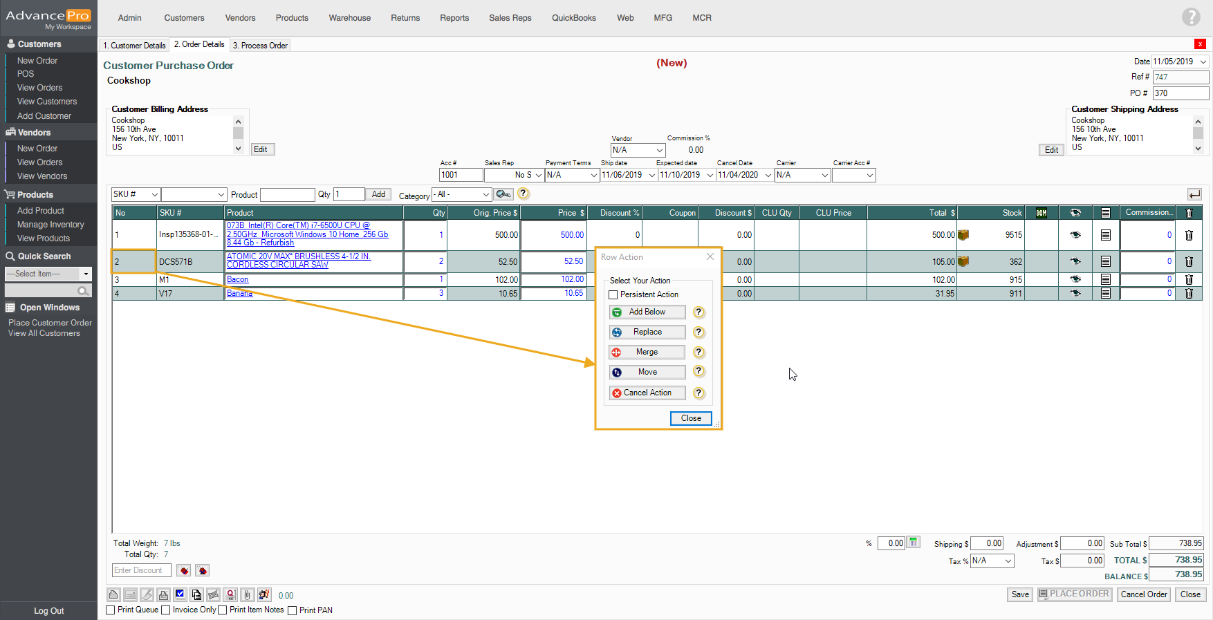 Note: The price of the merged items will follow the item that was merged into.- In order to use the Merge function, the user must add a duplicate Product to the order