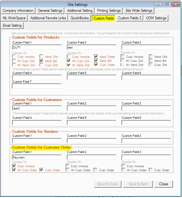 2. Type in the Column Header for Custom Field 1 under Custom Fields for Customer Order.