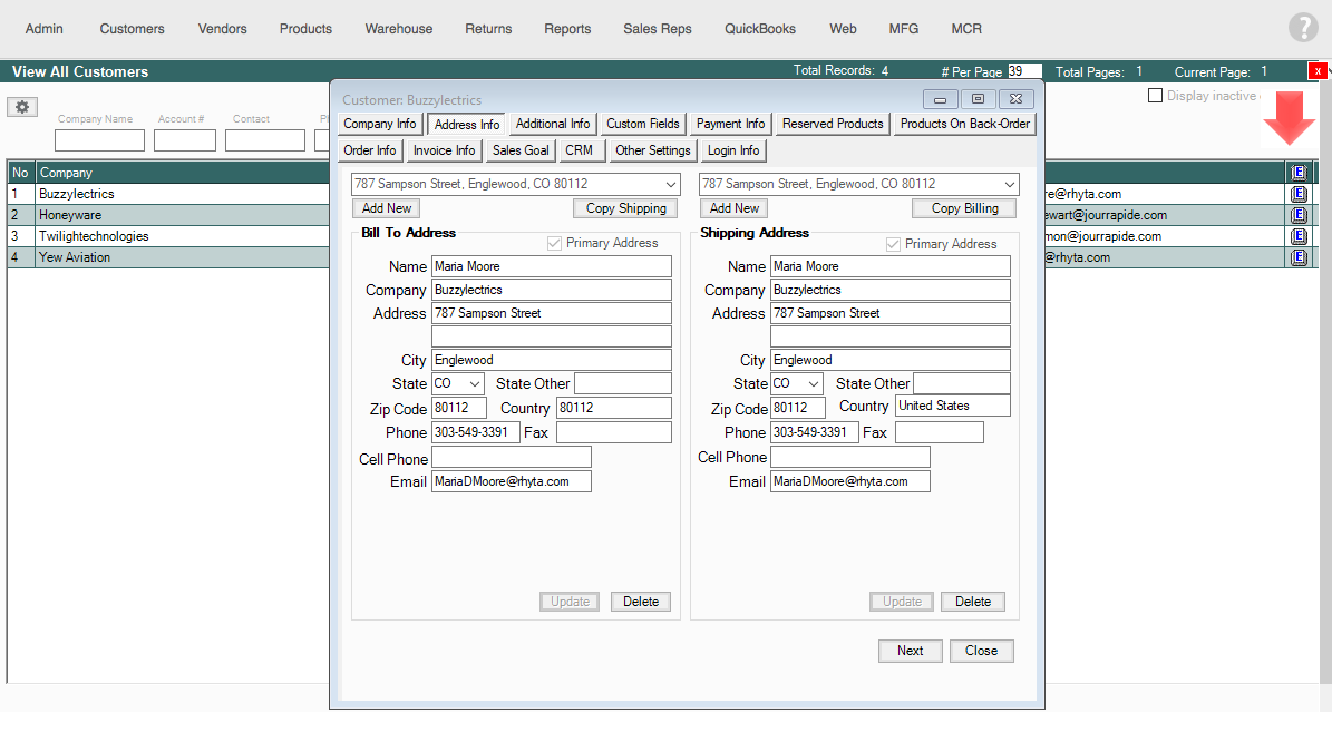 2. To view or edit a customer click the E button and you may edit your company info, add or update bill to and shipping address.