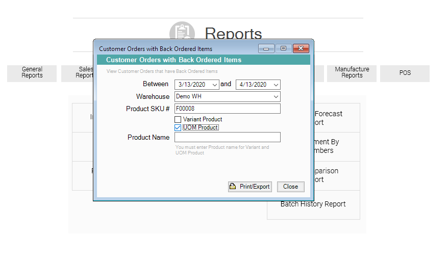 The Customer Back Ordered Items Report form will open. Enter the date range for the report.