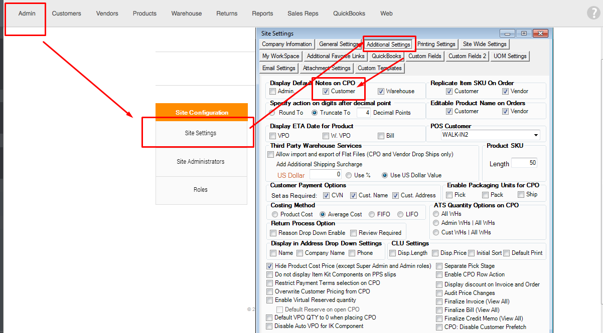 When printing Customer invoices, you will be able to put a default customer specific invoice notes at the bottom of the printout.To enable this feature, you will need to go to the Admin switchboard > Site settings > Additional Settings > Display Default Notes on CPO > put a mark on Customer then Save and Close.