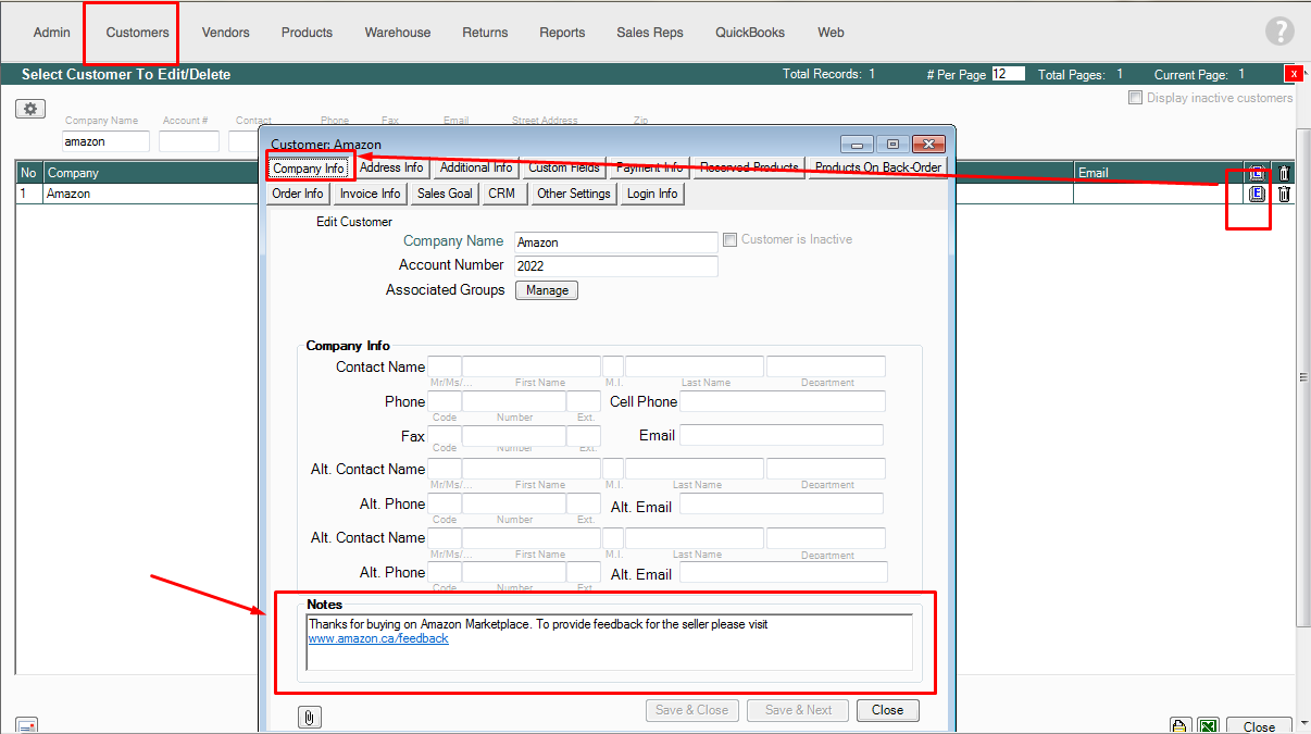 After activating the feature, you can now set the notes for each customer. You can go to the Customer switchboard > Edit Customer > Company Info and enter the desired notes at the bottom. Click Save and Close when done.