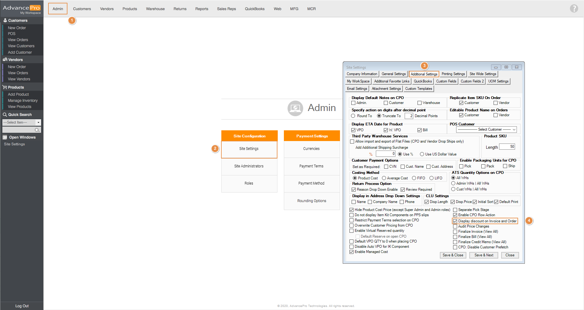 - In order to enter a discount percentage on customer orders, you must first enable the Display discount on Invoice and Order option found on Admin > Site Settings > Additional Settings and click on Save & Close.