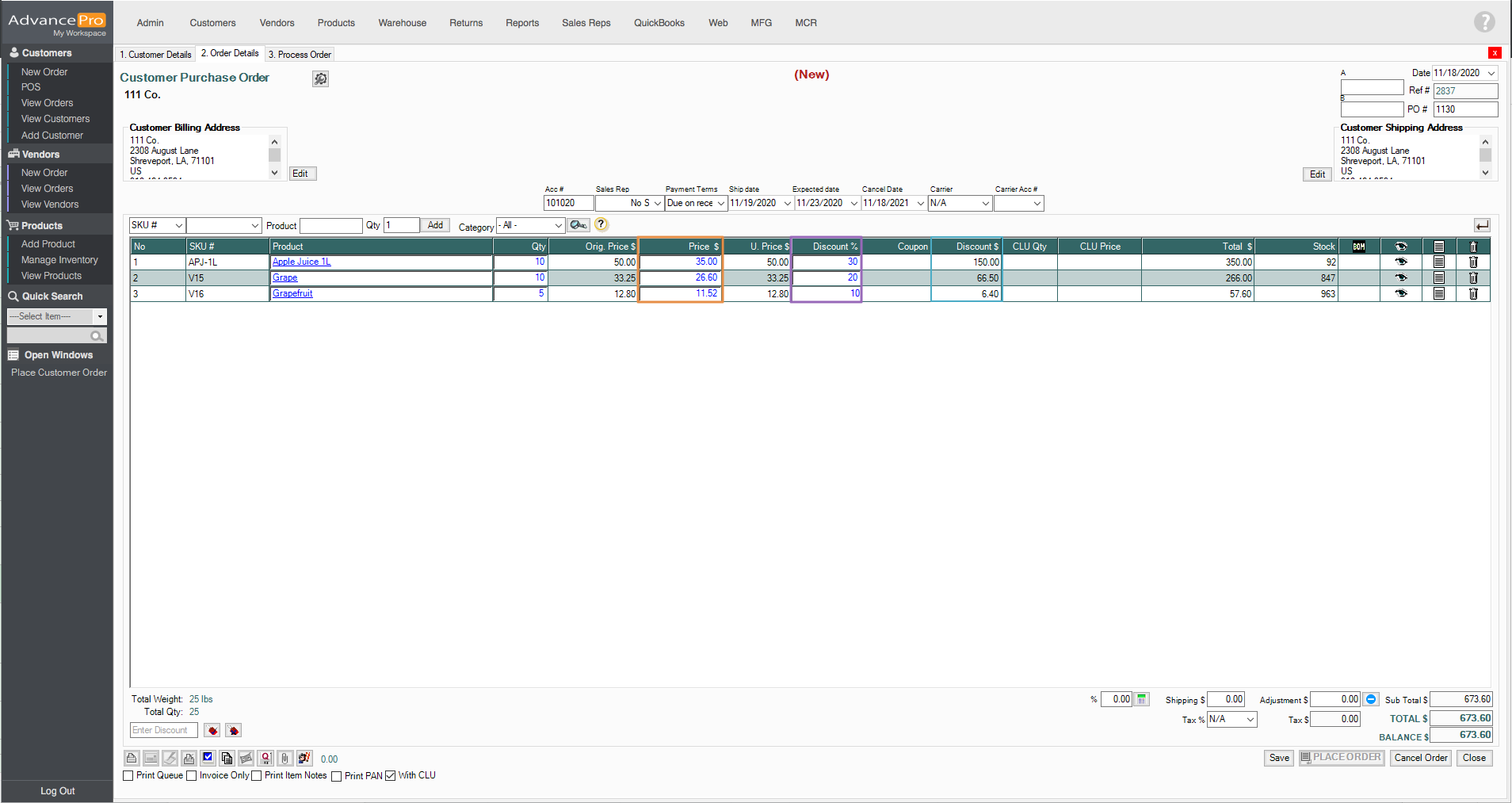 - When discount values are entered on the Discount % field, it will automatically calculate the Price $ and the Discount $.