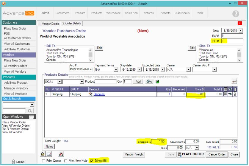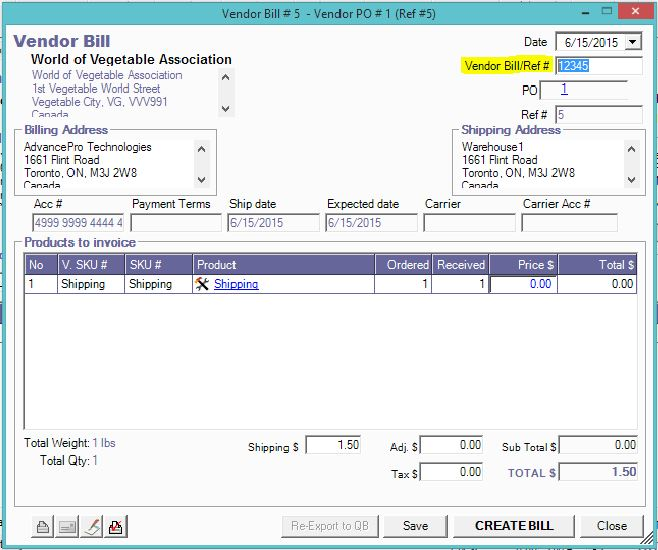 6. PLACE the order and create the bill. Enter the same Vendor Bill/Ref # as the previous order that was billed.