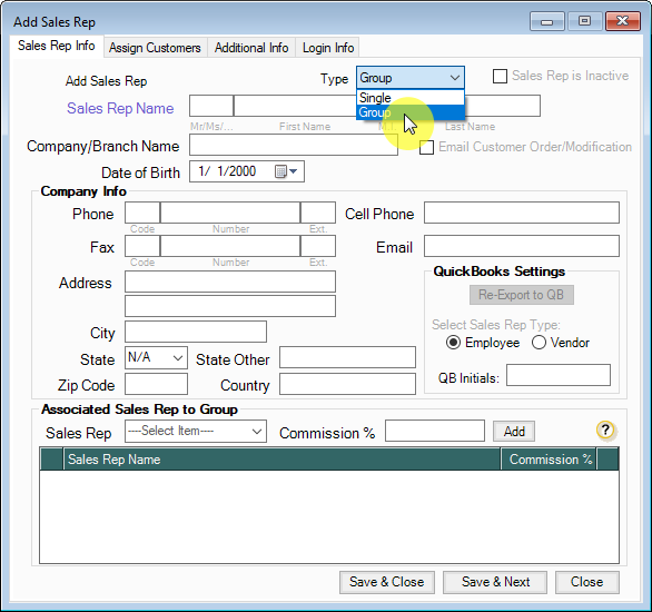 • On the add Sales Rep Window, select the Type dropdown and select Group