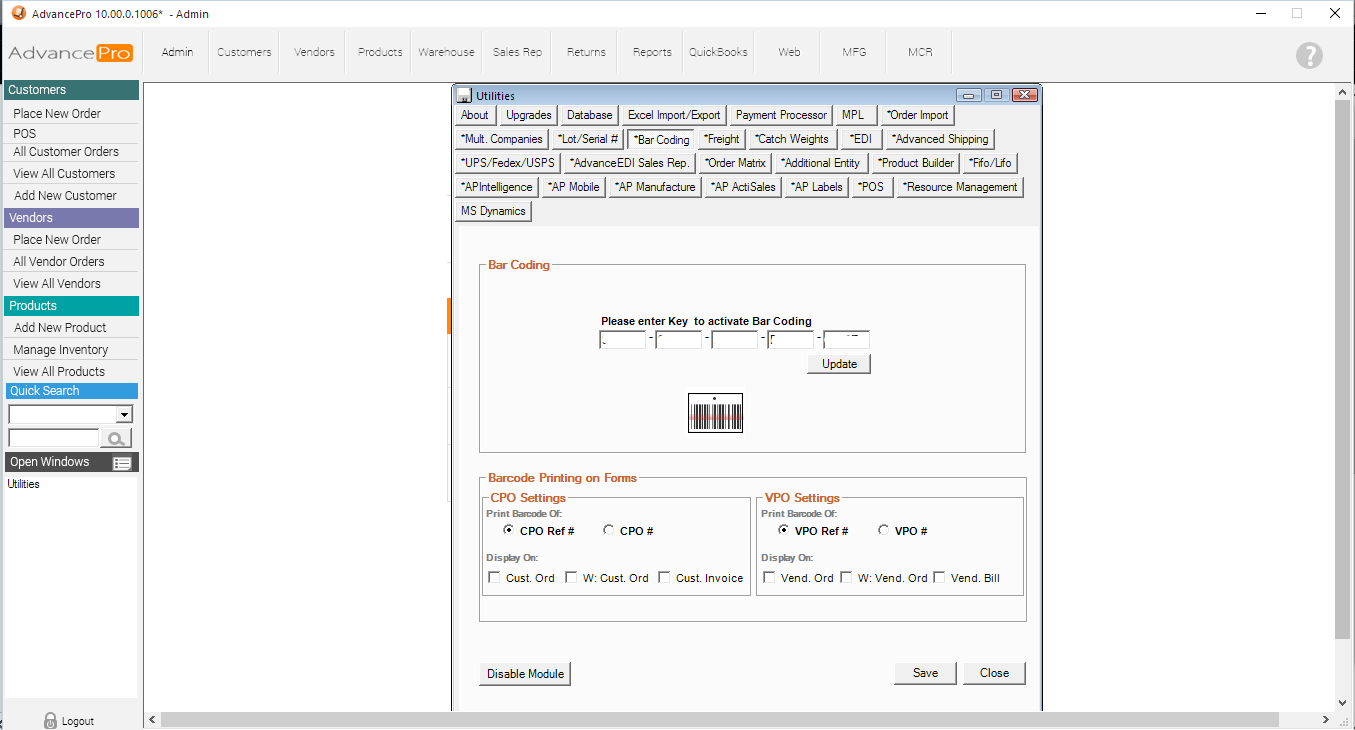 To Activate Barcode Scanner module, go to Admin >> Utilities