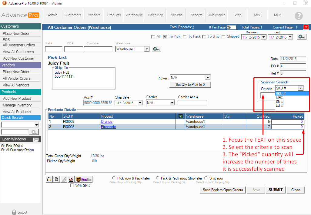 See the attached VIDEO for an actual representation of the BARCODE SCANNER and the PICK LIST screen