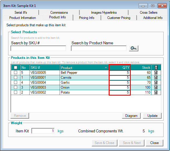 4. The selected items will appear in the Item Kit > Product Info tab. Enter the quantity of the added products