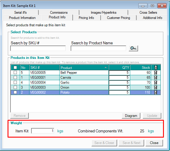 bottom right. Use this weight or enter a new weight for the item kit in the field at the bottom left.