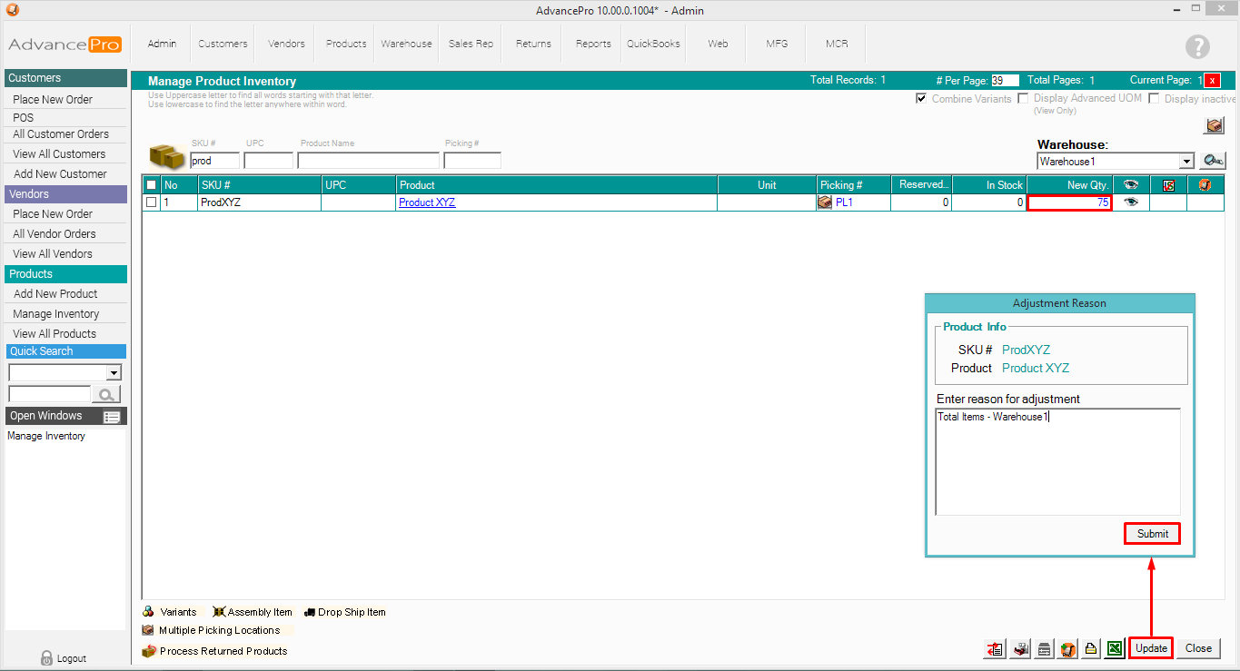 A dialog box will appear. Enter the reason for the Adjustment and hit Submit