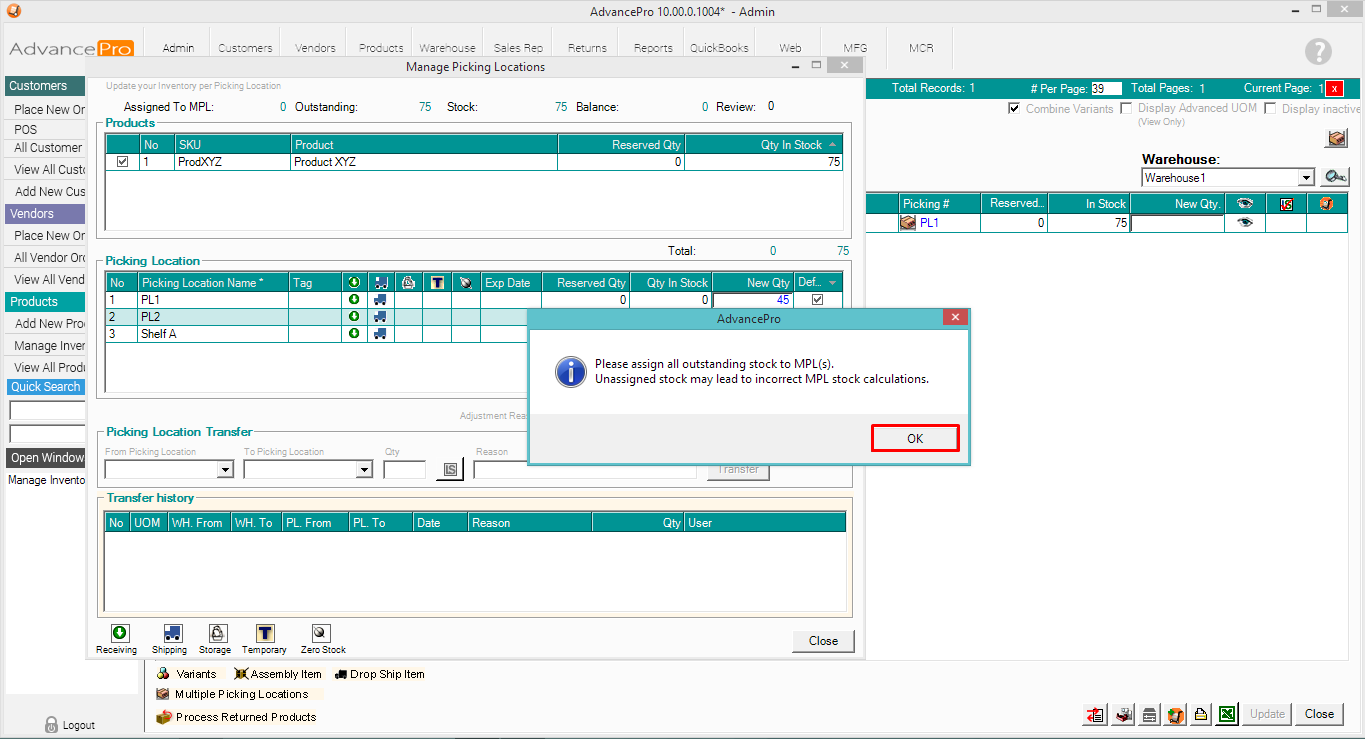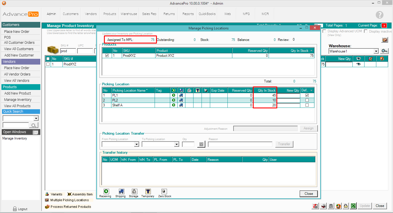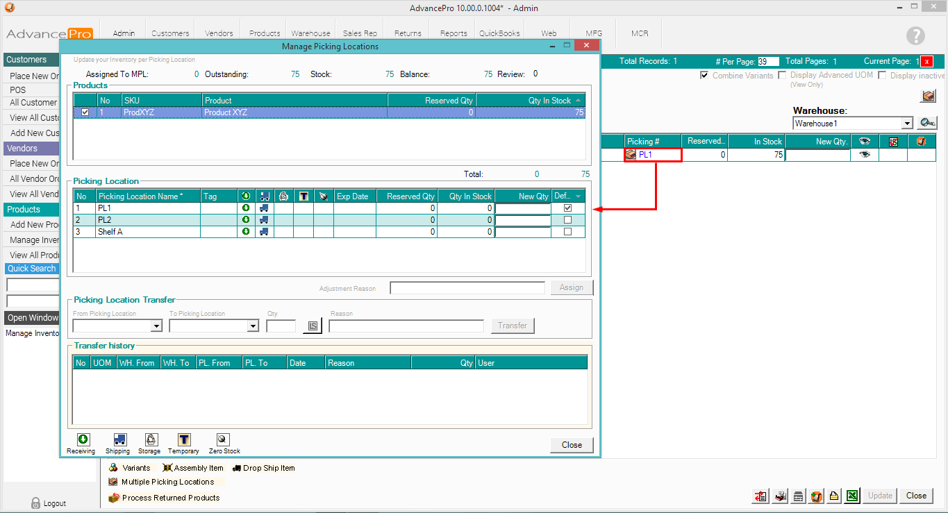 2. After entering the total in stock quantity, click the Picking #, "PL1", and the Manage Picking Locations screen will appear.