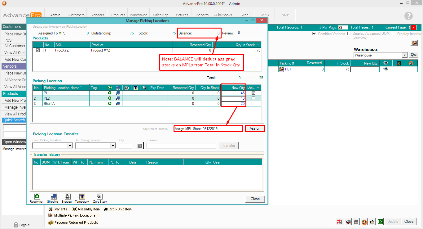 3. Designate the stock quantities on your Picking Locations. The Balance qty will be deducted simultaneously when entering the New Qty.