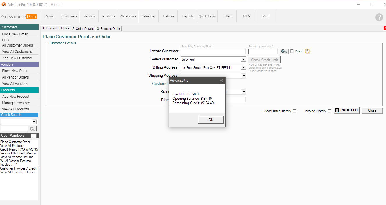 A pop up screen will display the credit limit of your customer based on your QuickBooks file, so make sure it is open.