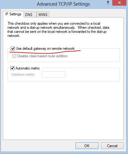 - On the Properties window, click 'Advanced' and then uncheck the "Use default gateway on remote network" option and click 'OK'