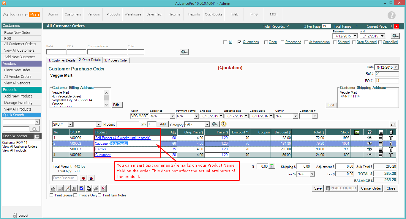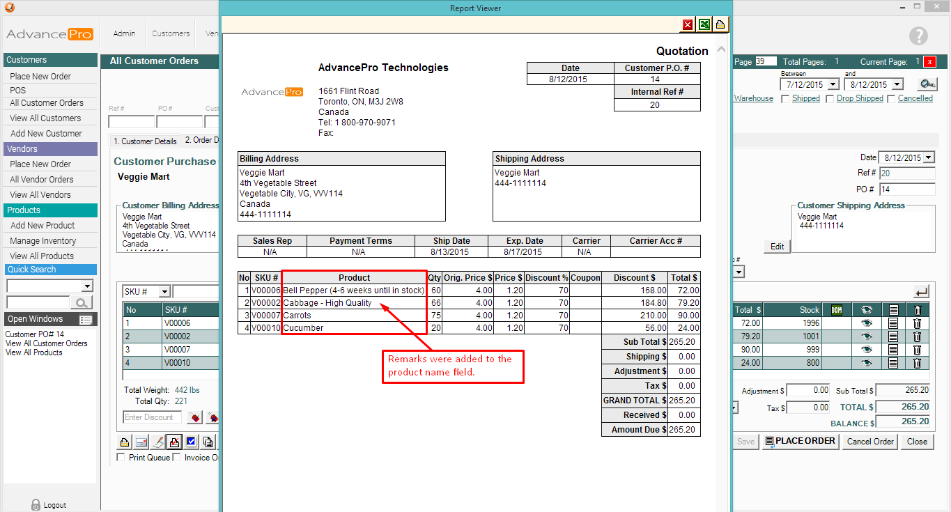 3. Open an order and click on the Product Name field on any line item. You can now add remarks to a line item. This will appear on the printed format.