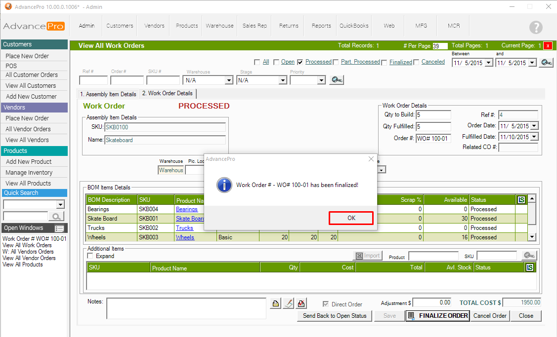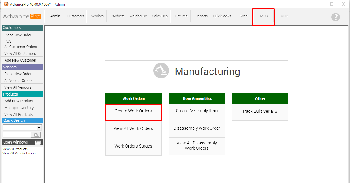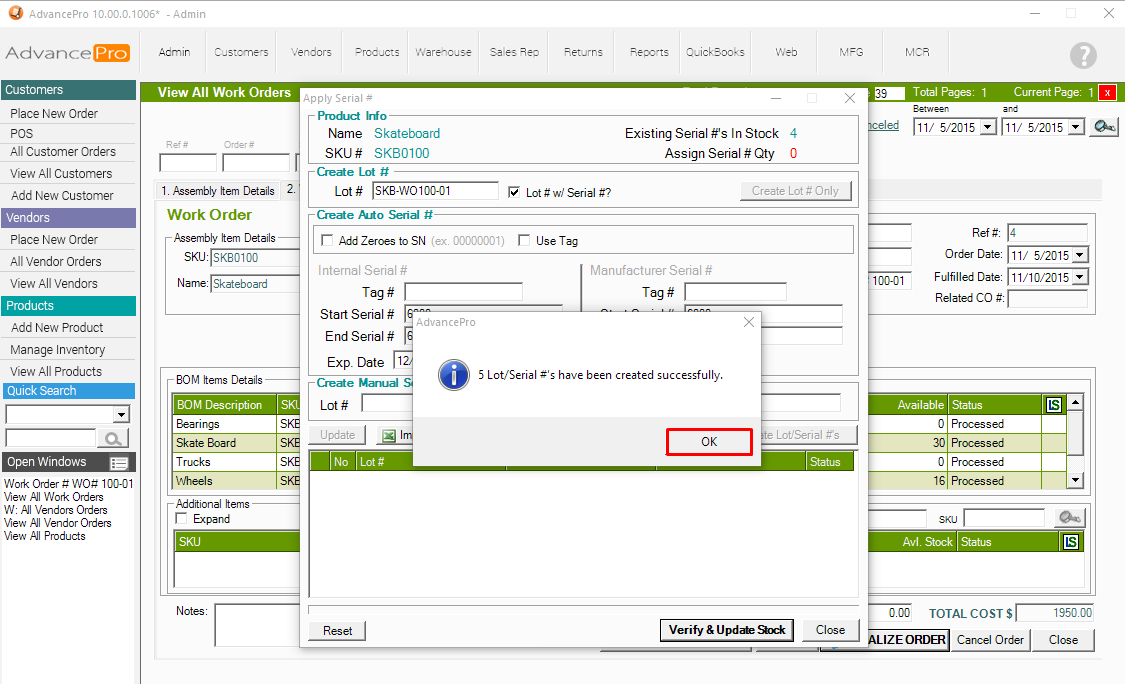 8. Go back to MFG Module >> View all Work Orders