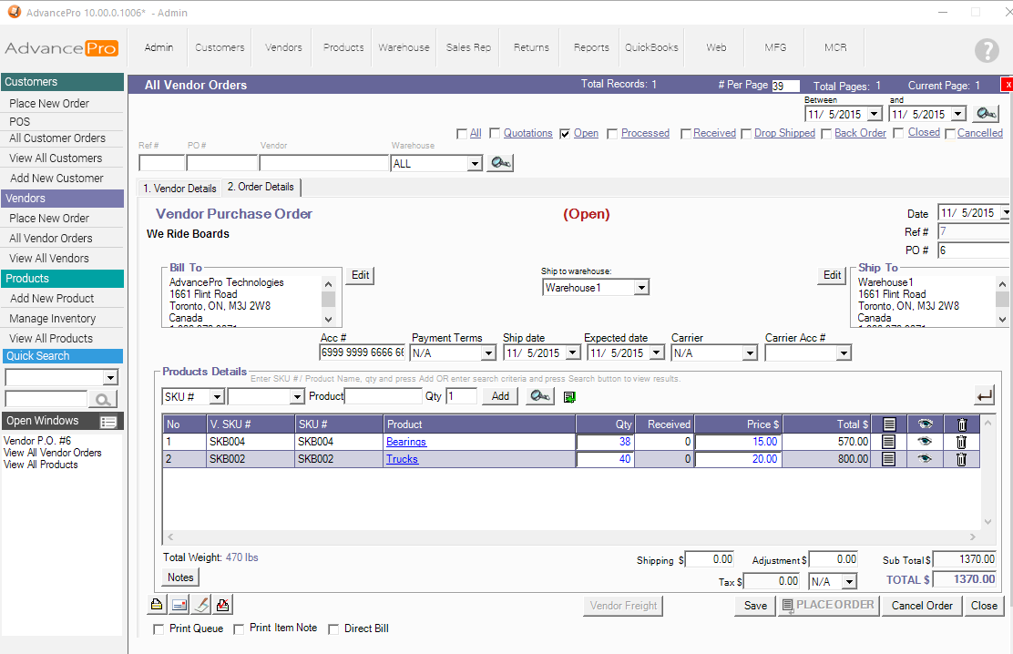 5. Save and Process the Vendor Order to the Warehouse (or you can create a Direct Bill for the order)