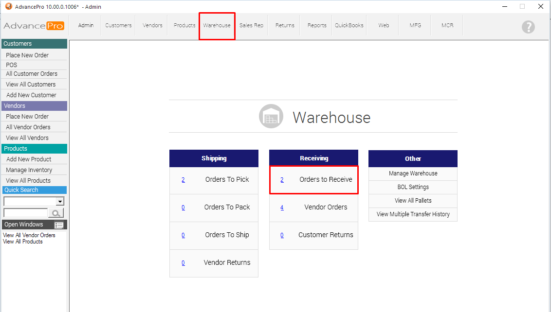 6. Receive the order at the Warehouse stage >> Orders to Receive