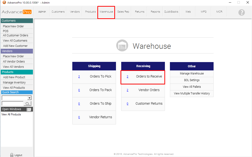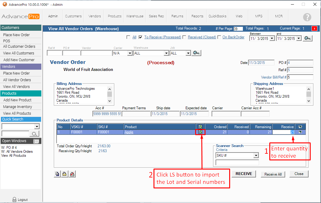 2. Enter the quantity to receive, click or double click the [L/S] button on the line item.