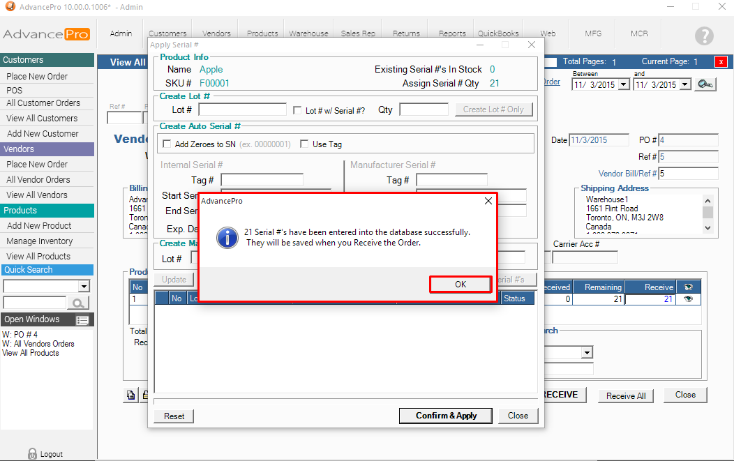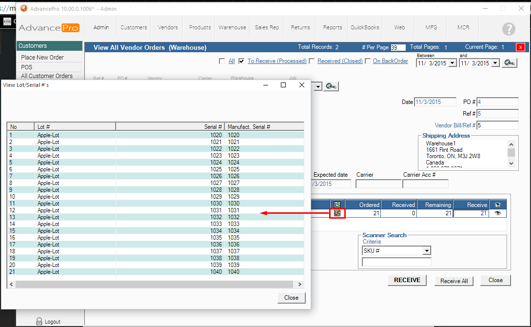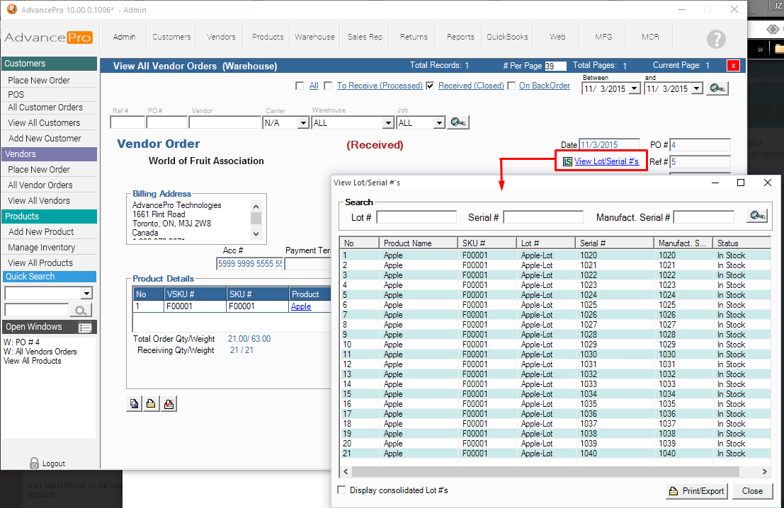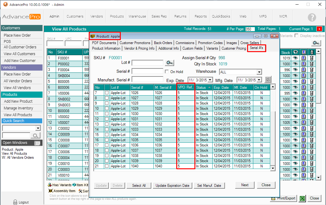 10. You can also go to View/Edit All Products and locate your product >> Hit the [E] Edit Icon >> Serial #'s Tab and you will be able to view the details of the lot and serial numbers, with their VPO Ref #