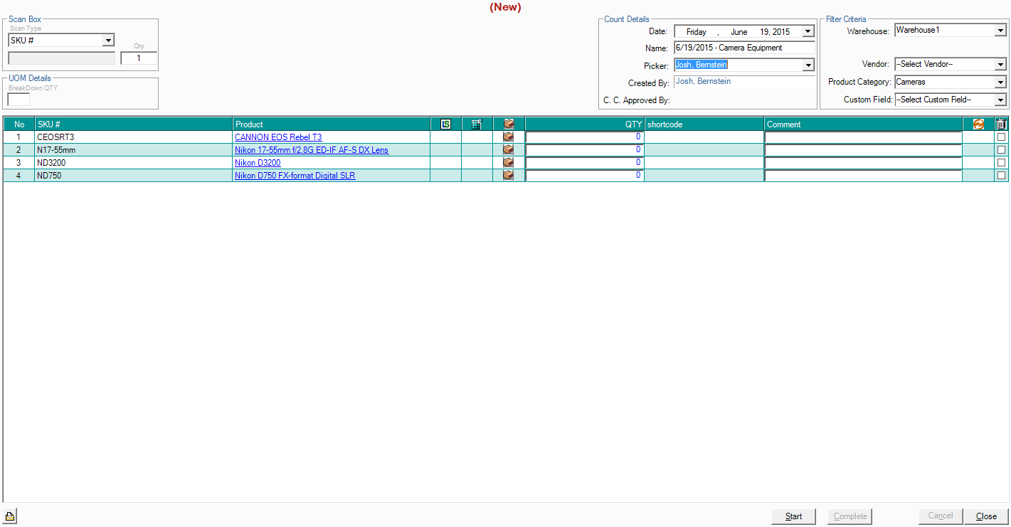 - Click "Start" at the bottom right hand side of the screen in order to begin the cycle count