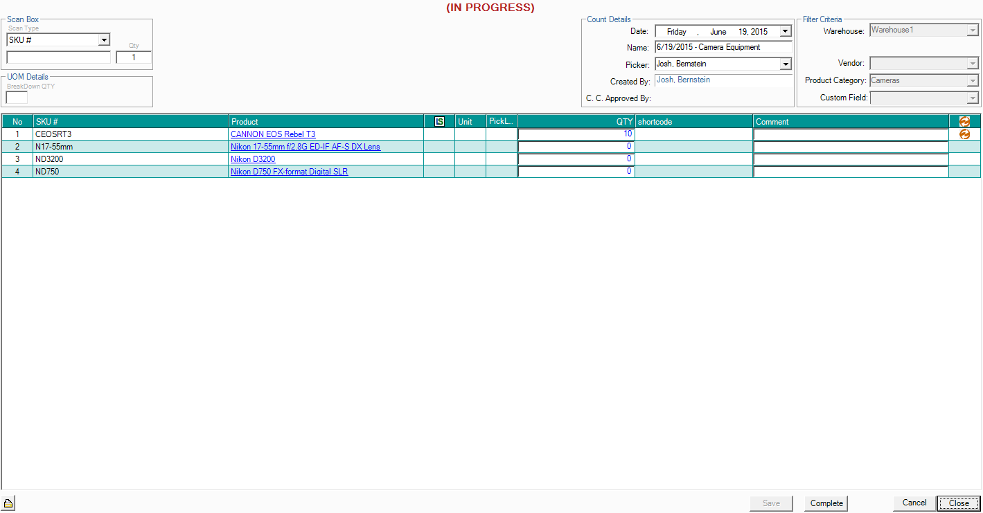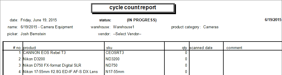 - Once the cycle count sheet has been filled out, click "Products > View All Cycle Counts" and select "In Progress", then select your cycle count