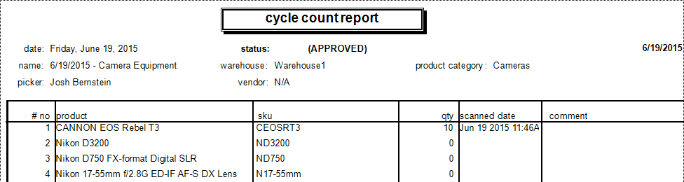 - Review the cycle count, comparing "On Hand" quantities with "QTY" entered during the cycle count, then click "Approve" to update the quantity in AdvancePro