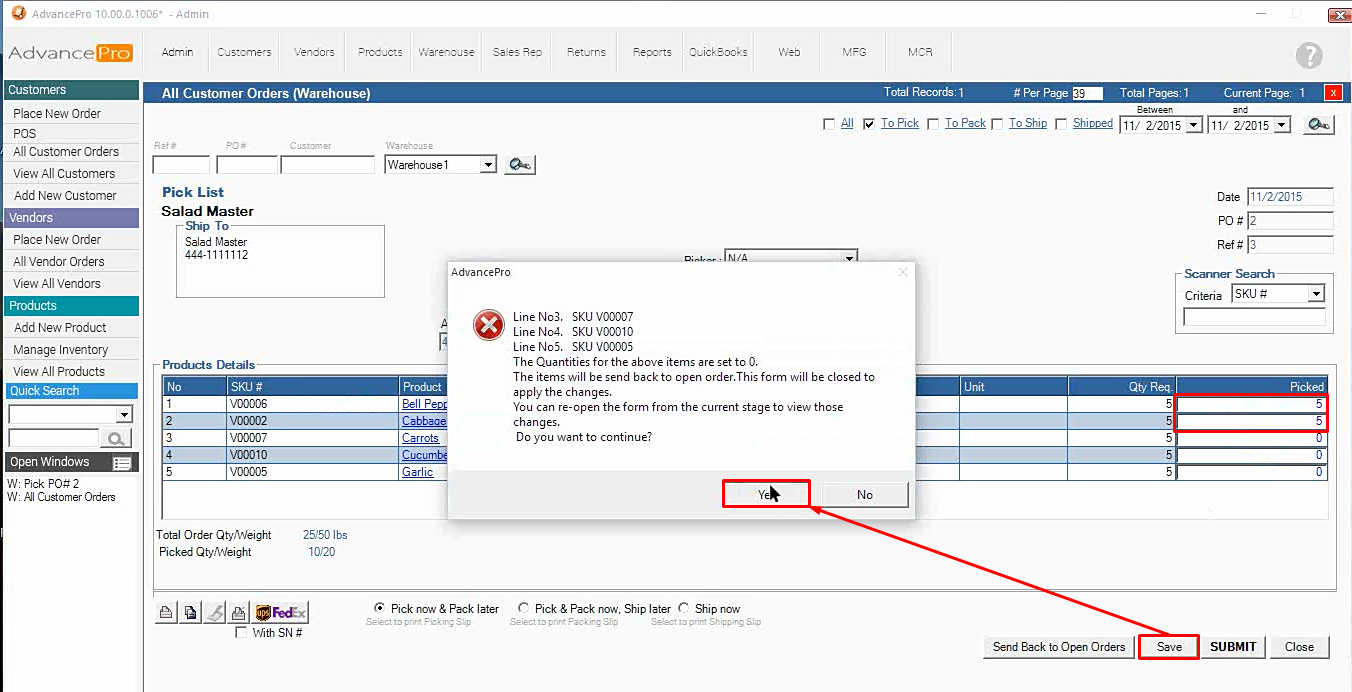 4. Pick only a few out of the line items, 2/5 line items in this case. Hit Save and confirm (OK)