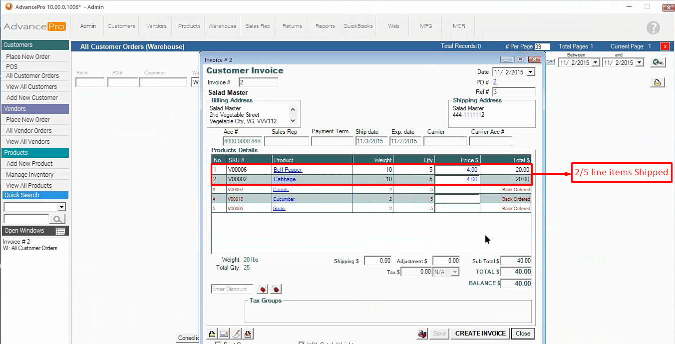 6. Once Invoiced, the order will have RED FONT for the items that were not shipped (or were backordered) and you can go back to this order form and ship it when ready.
