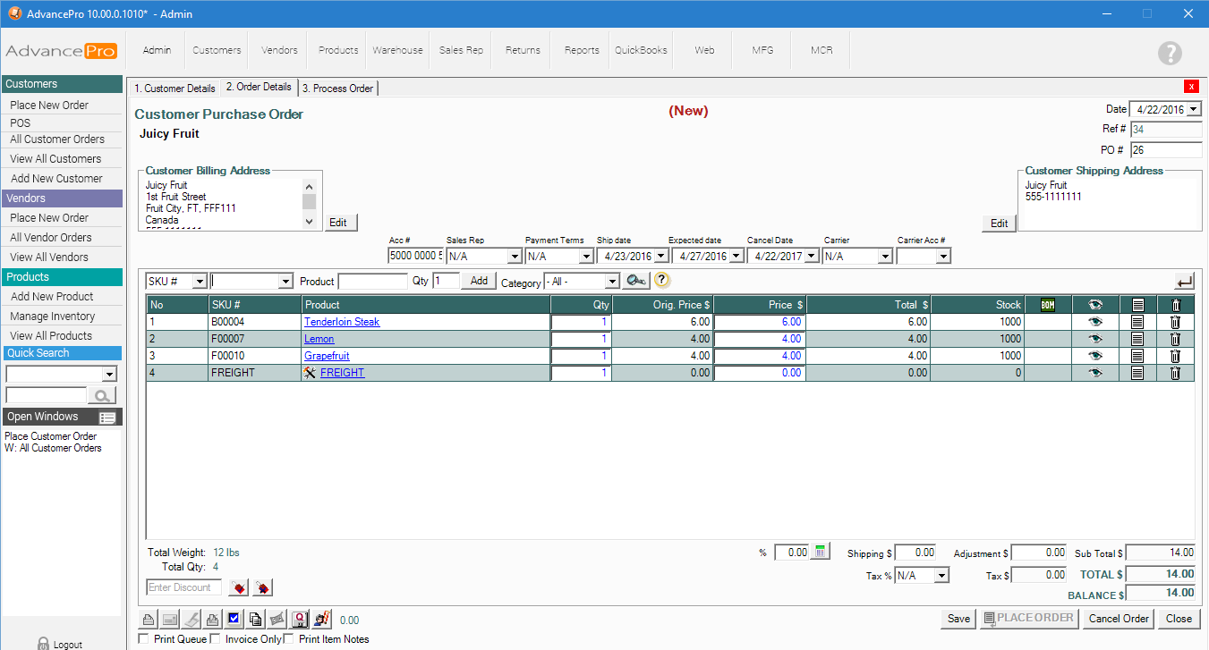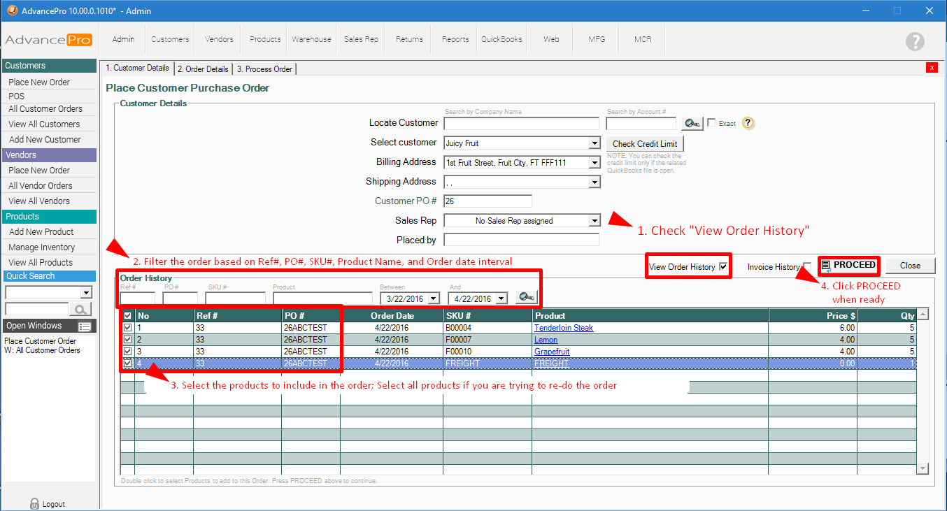 To recreate a customer order basing from the customer's order history, place a Customer Order and select the customer on this screen.