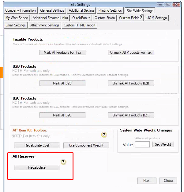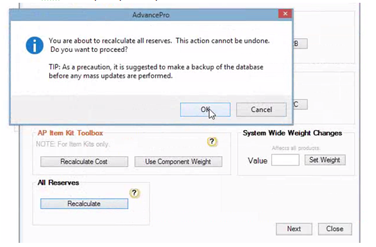 To ensure that your reserved inventory is intact and/or corrected, AdvancePro now has a feature that safely recalculates all your reserved inventory.