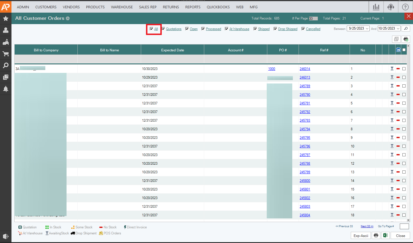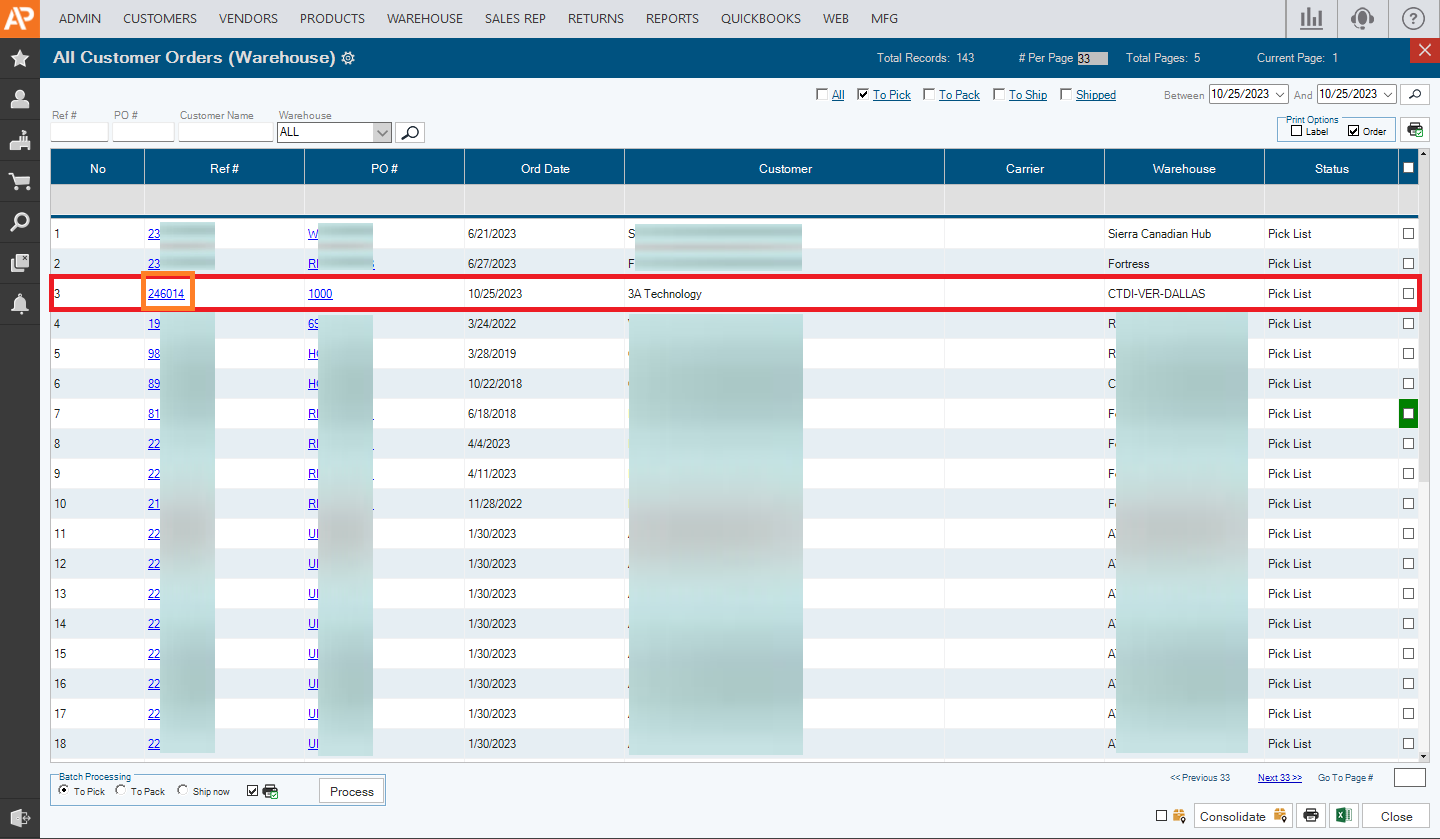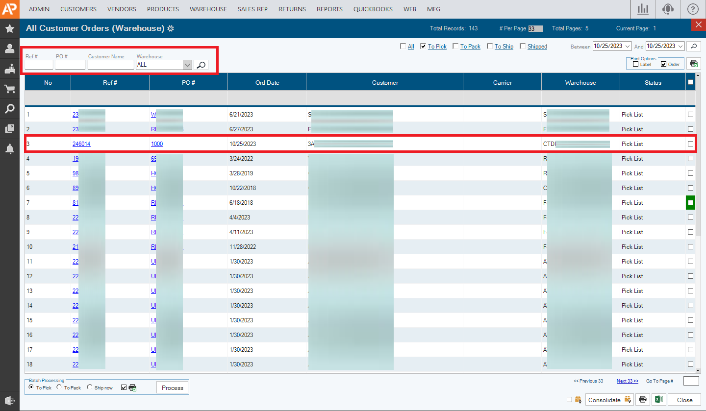 5. Find your Order you can search for it using Ref #, PO#, Customer Name, and Warehouse and click the search icon