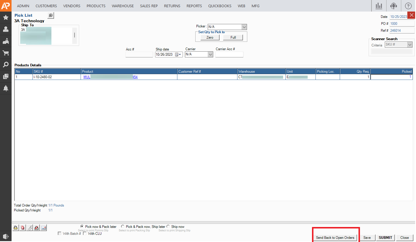 7. Select >> SEND BACK TO OPEN ORDERS