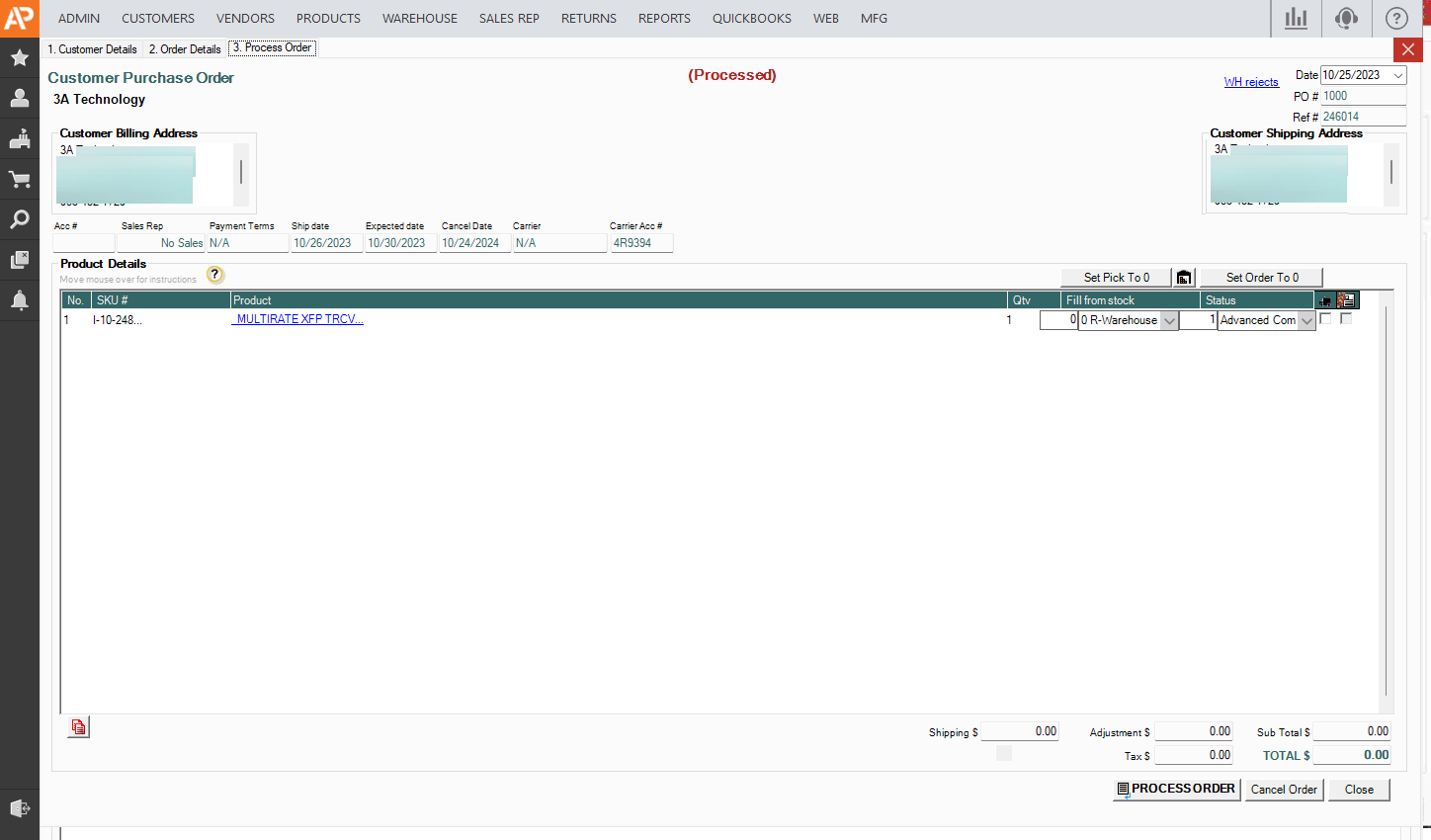 1. Select >> WAREHOUSE location you like and select PROCESS ORDER when finished