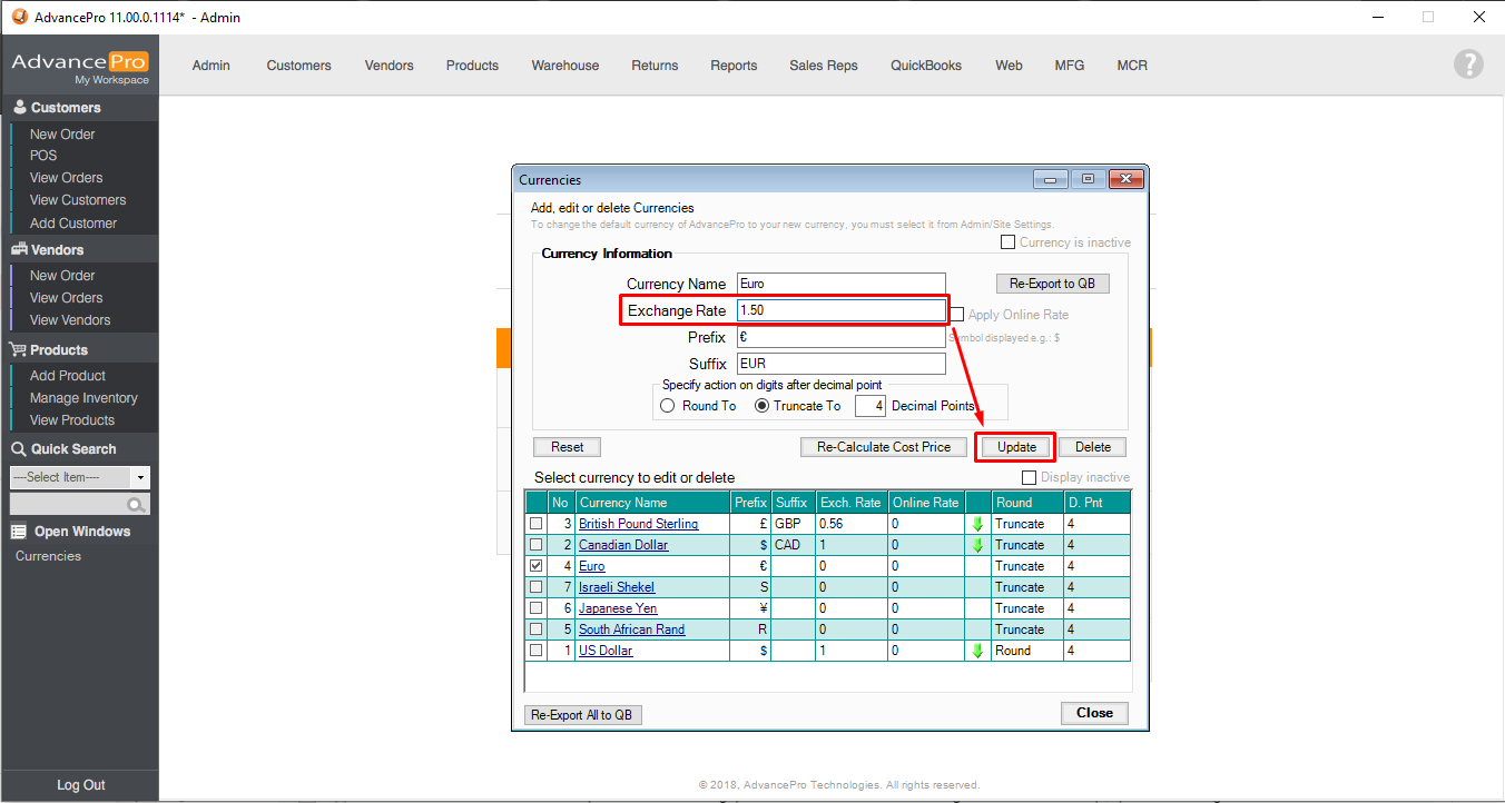 There will be a list of inactive currencies in the currency list in QuickBooks. Enable the currency you want to use if it is the same name in AdvancePro (EURO=EURO)